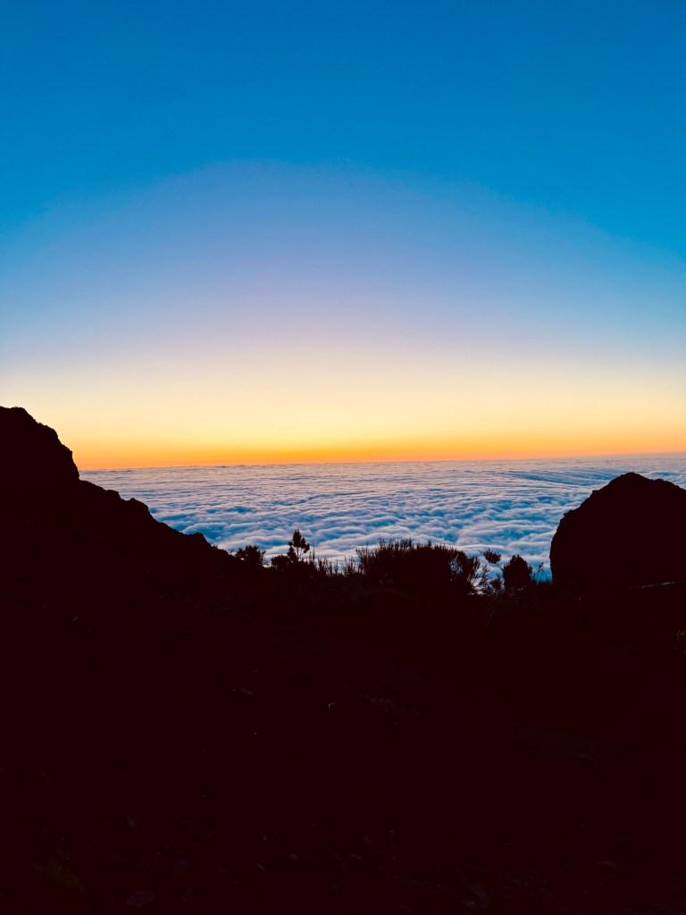 We made it to the trailhead parking lot by 6:00AM climbing up the backbone of Pico do Areeiro in the dark, headlamp cutting through the chill. At the summit, the world opened up: a sea of clouds below, the orange sun rising like fire over a kingdom of stone. I stood there, wind in my face, and felt something ancient stir—like the mountain was reminding me what it means to be small and alive at the same time.